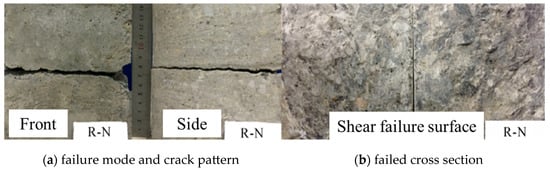 Figure 3a shows the failure mode and crack pattern of the specimens. In most cases, a typical interface shear failure mode was observed at the new-to-old interface. The specimens were split into two parts as soon as the clear shear crack formed along the shear plane, where the process exhibited a brittle failure. The primary shear crack appeared to be approximately horizontal.