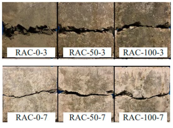The typical failed cross-section is shown in Figure 3b. For both the new overlay and old substrate part that constituted the RAC, localized failure occurred as some recycled aggregates were sheared off along the failure plane. As the ordinary concrete was used as an old substrate component, the failed surface remained as before, while, as the ordinary concrete was used as new overlay part, some spalling cement paste fragments were observed at the interface.