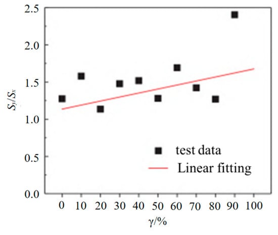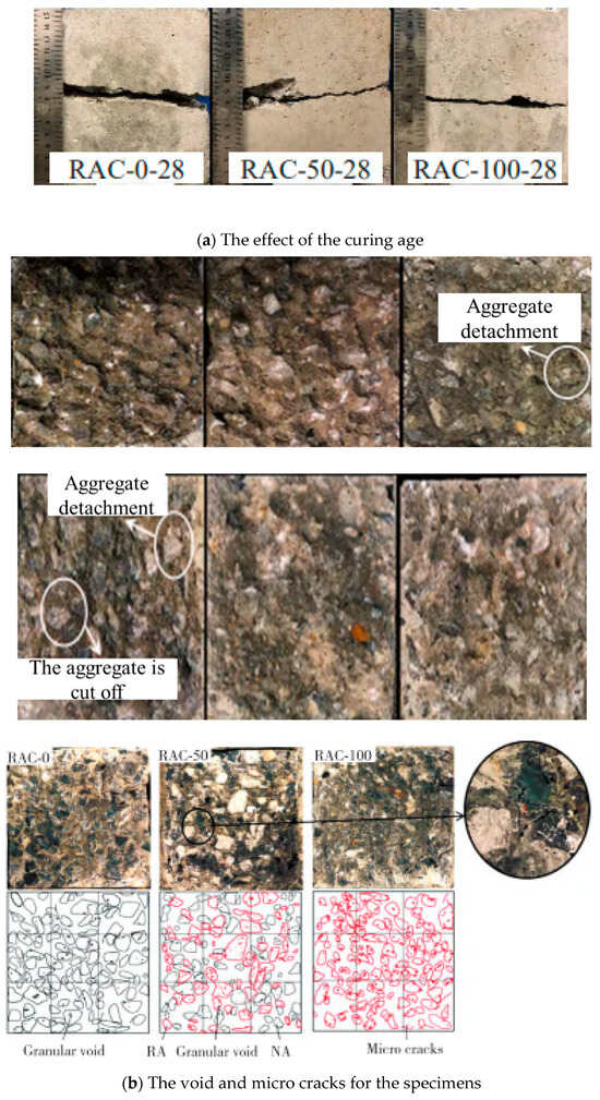 Figure 4b details the failure sections of the specimens. As shown in the figure, the black line represents the intact aggregate, and the red dot at the red line block represents granular void in torn aggregates. The red line between the aggregates and cement paste represents the microcracks resulting from the defect of the transition zone between the cement paste and aggregates. For the specimens with a replacement ratio of 0%, few granular voids were found, and microcracks were primarily located in the transition zone. With the increase in the replacement ratio, more voids were observed on the cut aggregates, while the microcracks remained consistent. This demonstrated that the effect of the replacement ratio plays a critical role in influencing the shear failure mode.