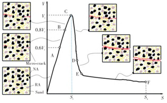 - Elastoplastic phase (AB). In this phase, microcracks developed in the internal structure and surface of the RAC, with shear stress reaching 60~80% of the peak value. With the presence of the microcrack in the cement paste, the cohesive effect of the concrete decreased. Meanwhile, the shear resistance is gradually transferred to the combined action of aggregate interlock and friction.