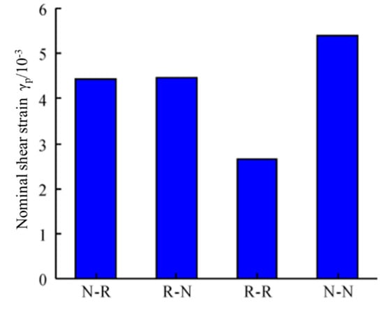 For the type of overlay concrete, compared to the R-N specimen, the shear strain of the R-R specimen was reduced by 40.7%. A reduction of 18.2% in shear strain was observed for the N-R specimen compared to the N-N specimen, while, for the type of substrate concrete, as the concrete type changed from the NAC to RAC, the shear strain decreased by 40.0% and 17.3%, respectively, corresponding to the overlay concrete type of RAC and NAC. This means that regardless of RAC being used in the substrate part or the overlay part, a significant decrease was found in the shear strain. The probable reason for the result is that there are many weak regions in the shear plane since the existence of transition zone between the new cement paste and the old cement on the RCAs resulted in a worse deformation ability.