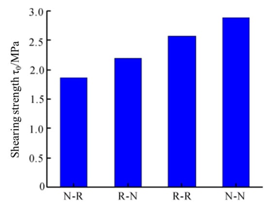 Figure 7 shows the comparison of the bonded shear strength for each specimen. From the figure, it can be seen that the shear strength of the R-R specimen increased by 17.18% compared to the R-N specimen, while, compared to the N-N specimen,, the shear strength of the N-R specimen decreased by 35.25%. The shear strength of the R-R specimen increased by 37.54% compared to the N-R specimen, and the shear strength of the R-N specimen decreased by 24.00% compared to the N-N specimen. The main reason lies in the inferior properties of RCAs (e.g., density, crushing index) compared to natural coarse aggregates. With the increase in the replacement rate of RCAs, the internal weak zone of RAC increases, specifically the interface zone between old and new mortar and the interface zone between virgin coarse aggregate and old and new mortar, which contributes to the reduction in strength. This phenomenon is similar to the previous study [] that found that shear strength had a decreasing trend with the increase in RCA replacement ratio. However, these specimens with different interface toughness compared to the literature should be paid attention.