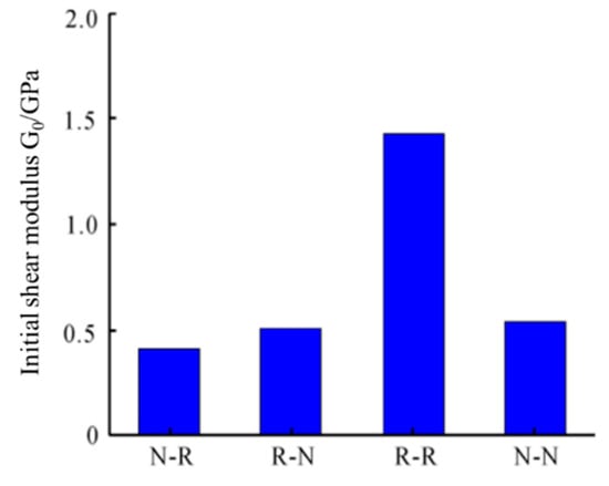 Figure 8 shows the comparison of the initial shear modulus of each specimen. From the figure, it can be seen that the shear modulus of the R-R specimen increased by 183.47% compared to the R-N specimen. In contrast, the shear modulus of the N-R specimen decreased by 24.68% compared to the N-N specimen. The shear modulus of the R-R specimen was 247.92% higher than that of the N-R specimen, while the R-N specimen showed a 6.26% reduction compared to the N-N specimen. These findings suggest that when recycled concrete is used as the old substrate, employing recycled concrete for the new overlay significantly increases the stiffness of the specimens. The observed variation in stiffness between different interface types is likely due to the inherent properties of RCAs and the experimental variability