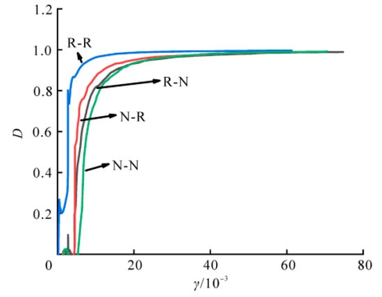 According to Equation (1), the evolution curves of the damage variable D to the shear strain of the specimens with different interface types are shown in Figure 9. With the increase in the shear displacement, initially, the damage increased rapidly, and the increasing rate of damage variable gradually decreases when the shear displacement increases further; finally, the damage variable tends to 1. It can be seen that the R-R specimen exhibits the fastest damage progression speed, while the N-N specimen shows the slowest damage progression speed. It denotes that the incorporation of RAC could accelerate the evolution of damage. This may be attributed to the inherent microcracks and damage of the RAC.
