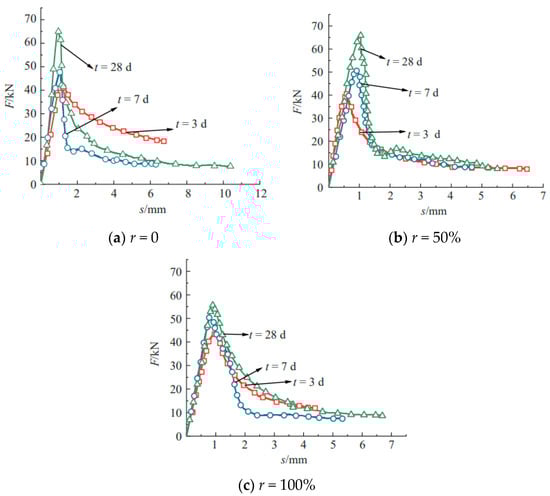 Figure 10 show the shear load–deformation curves of the specimens with different curing ages and replacement ratios, where all interface types consist of RAC-to-RAC. Overall, the peak load increases with the increase in the curing ages for all the specimens. For all the replacement ratios, the ascending branch of the shear load–deformation curve for 28 days displays a slightly higher shear capacity compared to the other two curves in the elastic stage. This is because after the long-term curing, the hydration reaction of the cement was complete and the elasticity modulus improved significantly. The transition zone near the peak load on the curve is wider for the specimen of 3 days curing age compared to those at 7 days and 28 days. The descending branches of the specimens with 28 days present a brittle property by exhibiting a steeper slope than the other two. With the increase in the replacement ratios, the curves of the different curing ages are nearly overlapped. This is mainly because the high replacement ratio resulted in a high water absorption, which accelerated the hydration reaction.