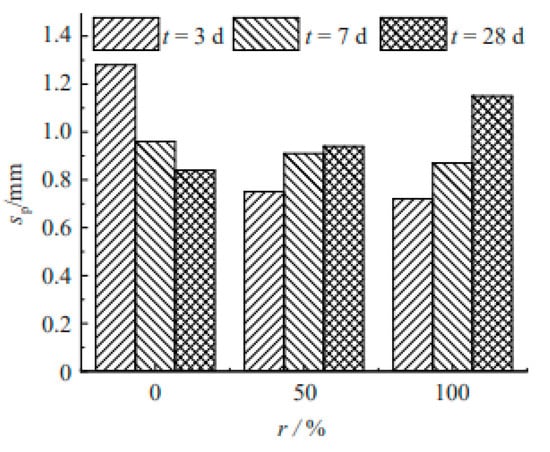 The test results of the displacement corresponding to the peak load for the specimens are compared in terms of the different replacement ratios, as shown in Figure 13. At the curing age of 3 days, the displacement decreased with the increase in the replacement ratios. However, at the curing ages of 7 days and 28 days, an inverse trend was observed. In the early stage, due to the incomplete hydration reaction, the replacement ratio has a slight influence on the property of the concrete. After 7 days, the higher replacement ratio, coupled with a lower water–cement ratio, resulted in larger displacement.