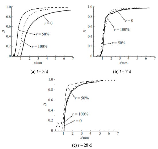 According to Equation (1), the evolution of damage against replacement ratio and curing ages are calculated, as shown in Figure 14. For the specimens at curing age of 7 days and 28 days, the damage curves with different replacement ratios overlap, while for the specimens at the age of 3 days, the damage curves diverge for different replacement ratios. This may be because in the early stage the replacement ratio has a slight influence on the damage evolution.
