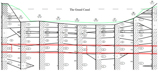 The project is located in Jining, Shandong Province, China. The total length of the power pipe corridor for this project is approximately 3.4 km, with a segment requiring underground pipe jacking to pass beneath the Beijing–Hangzhou Grand Canal. The stratigraphic cross-section beneath the Grand Canal is depicted in Figure 1. This section of the canal was excavated between 1959 and 1960, encompassing a total length of 87.8 km and a basin area of 3306 km2. It serves as a large-scale river with multiple functions, including flood control, flood drainage, irrigation, and navigation. Field investigations revealed that the strata at the construction site can be categorized into 15 layers. The deepest soil layer to be traversed during the pipe jacking process is the 10th layer of silty clay. Being the most technically critical aspect (directly beneath the Grand Canal) of the construction project, this layer was selected as the testing soil for this manuscript. The detailed physical properties of this layer, as obtained from the site investigation report of the construction project, are presented in Table 1.