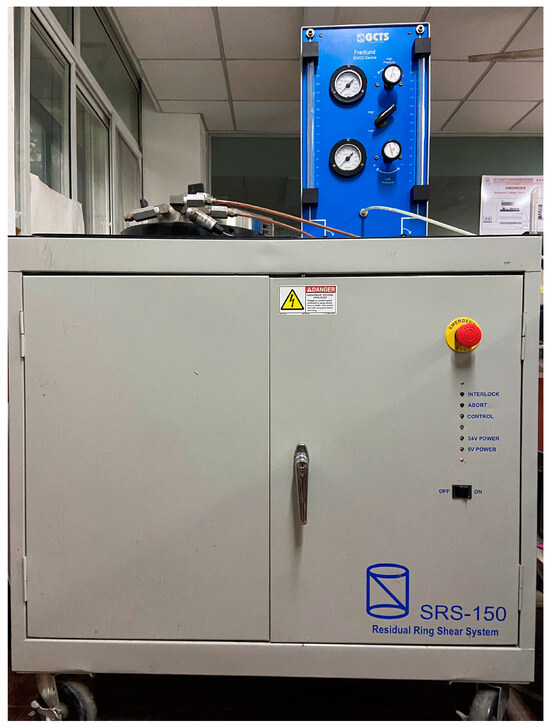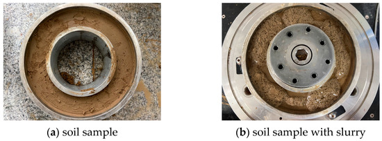 This interfacial friction test is conducted using the SRS-150 ring shear device, as illustrated in Figure 2. The SRS-150 apparatus effectively simulates interface friction characteristics and allows for the control of key parameters such as normal stress and shear rate during testing. The device comprises five components: the lower shear box, upper shear ring, data acquisition system, power system, and control system. The lower shear box features an outer radius of 150 mm, an inner radius of 100 mm, and a height of 25 mm, providing an effective shear area of 98 mm2. The lower shear box is bolted to the base of the ring shear device, while the upper shear ring (the metal surface used in our test) is secured to the power system. During the test, the lower shear box remains fixed, and the power system drives the upper shear ring to rotate, creating friction between the upper shear ring and the soil sample in the lower shear box. Normal pressure remains constant throughout the process, while the data acquisition system records the angular displacement, normal stress, and shear stress every 5 s. The soil is pre-conditioned to the on-site water content of 22% and placed in the lower shear box. Additionally, the soil sample in the lower shear box is pre-compressed before the test to ensure a flat friction surface, as shown in Figure 3a. Subsequently, thixotropic slurry is poured onto the surface of the soil sample, as depicted in Figure 3b.