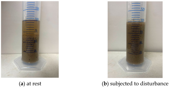 During the pressurization phase of the ring shear device, the slurry overflows through the peripheral gap. To closely simulate the behavior of the slurry during actual pipe jacking operations, a layer of thixotropic slurry approximately 5 mm thick is applied to the soil sample. The test is conducted rapidly, within a few minutes, to minimize errors that could arise from slurry extrusion. It is noteworthy that thixotropic slurry exhibits entirely different properties when at rest compared to when it is disturbed (e.g., through stirring with a glass rod), as shown in Figure 4. At rest, it demonstrates distinct stratification, while it becomes homogeneous when subjected to disturbance. When the bentonite content exceeds 15%, the solids in the slurry are not adequately dissolved, indicating that excessive addition of solid material (particularly bentonite) is ineffective. Finally, the power system is utilized within the control system to carry out the experiment.