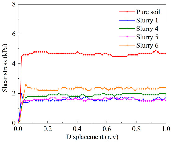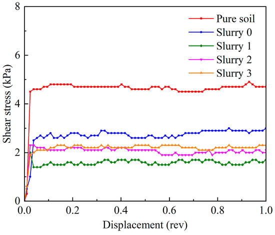 To visually compare the friction-reduction effects of different slurries, ring shear tests were conducted on various slurries under a normal stress of 15 kPa and a shear rate of 60°/min. Figure 5 presents a comparison of the friction characteristics among five different scenarios: pure soil, Slurry 0, Slurry 1, Slurry 2, and Slurry 3, all under a normal stress of 15 kPa. This comparison aims to analyze the effect of friction reduction attributed to bentonite, which is the primary component of the slurry. The results indicate that the friction coefficient between the pure soil and the upper shear ring is approximately 0.31. Due to the pre-compression of the soil, the shear stress remains within a relatively stable range. After the addition of Slurry 0, the shear stress decreased from about 4.7 kPa to approximately 2.7 kPa, resulting in a friction coefficient of 0.18, representing a 42.6% reduction in friction coefficient. This finding suggests that the lubricating effect of the thixotropic slurry primarily arises from the intrinsic properties of the slurry as a viscous fluid, while the contribution of its composition to the lubricating effect is secondary. The results with Slurry 1 show the best lubricating performance, characterized by a friction coefficient of 0.107, indicating a 65.5% reduction in the friction coefficient. This finding aligns closely with the results reported by Shou et al. [21]. In contrast, Slurry 2 and Slurry 3, which contain higher amounts of bentonite in their formulations, exhibited increased viscosity and instability in shear stress. This instability arises because the added bentonite does not fully dissolve in the water, leading to a less desirable lubricating effect compared to Slurry 1. The friction coefficients for Slurry 1 and Slurry 2 are approximately 0.14 and 0.15, respectively, indicating reductions of 54.8% and 51.6%. These results are similar to the findings in the work of Lam et al. [22], which states that “It was found that polymer fluids had little effect on the interface shear strength when compared with water”. Thus, the adequacy of mixing during the preparation of thixotropic slurry significantly impacts its lubricating performance.