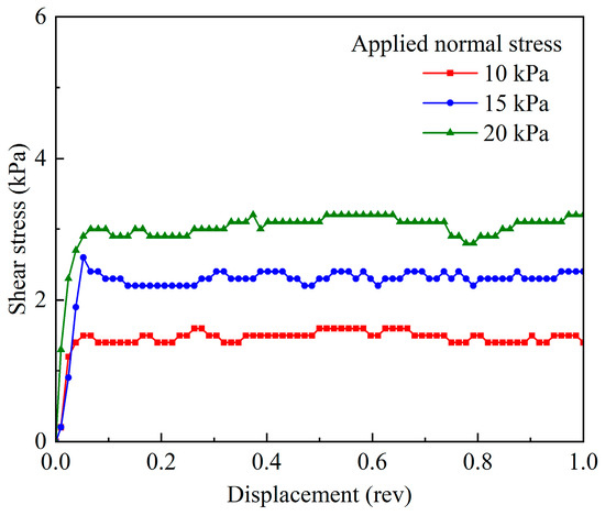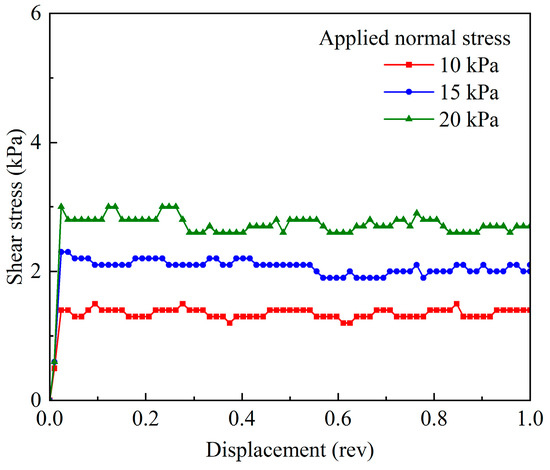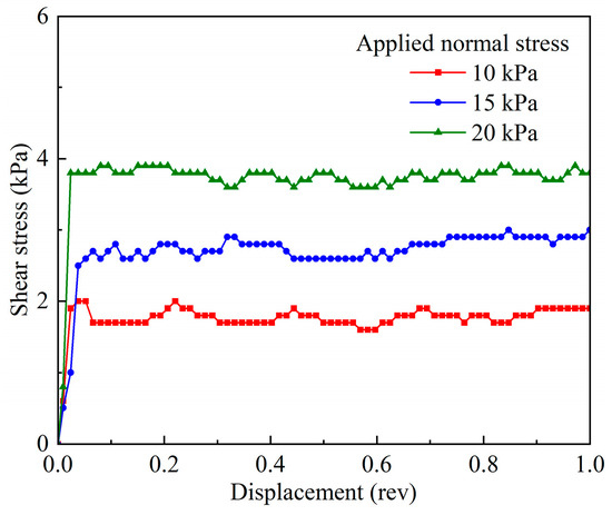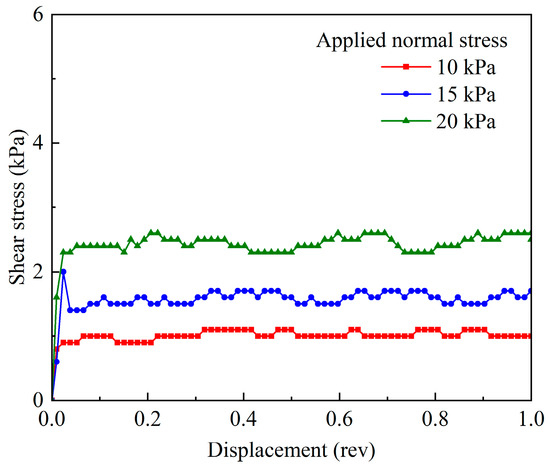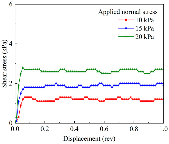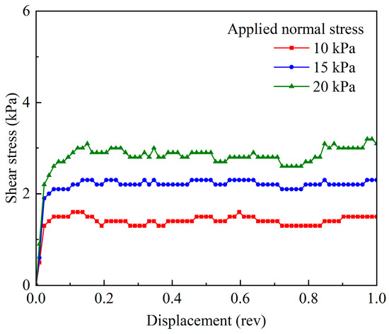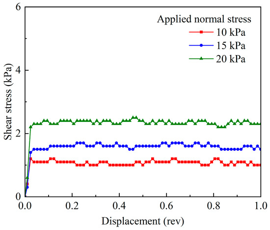 The normal stress varies continuously during the pipe jacking process, making it essential to study the effect of normal stress on the friction characteristics of the interface. For the proposed formulations, additional ring shear tests were conducted under normal stresses of 10 kPa and 20 kPa. Although actual in situ stresses may be significantly higher than the test values, the slurry experiences compression during the testing process. To ensure the sealing performance of the apparatus (preventing excessive slurry overflow), the tests are conducted under relatively low stresses to effectively demonstrate the influence of normal stress on the slurry’s lubrication performance. The testing results are presented in Figure 7, Figure 8, Figure 9, Figure 10, Figure 11, Figure 12 and Figure 13, and the corresponding friction coefficients are calculated and listed in Table 3.