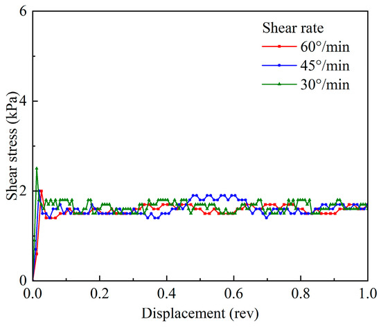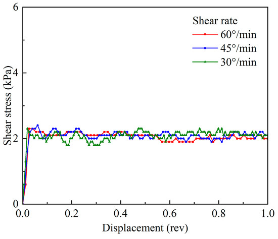 During pipe jacking, the jacking rate of the pipe varies with the conditions of the underground soil layer. Therefore, the impact of the jacking rate (i.e., shear rate in the test) on the friction characteristics must be considered. Figure 14 and Figure 15 present a comparison of friction characteristics at three different shear rates (60, 45, and 30°/min) under normal stress of 15 kPa, using Slurry 1 and Slurry 2 as lubricants. The variation in the number of data points for different shear rates is due to the fixed acquisition rate of the sensor, while the transverse coordinate is scaled in terms of displacement. It can be observed that the shear rate has little to no effect on the friction coefficient for Slurry 1. Although the laboratory tests were conducted rapidly, the pipe jacking process on-site progressed much more slowly. Considering the disturbance of the slurry, the results may differ from those obtained in a controlled laboratory environment. From a short-term perspective, shear rate may not significantly influence the lubricating effect of the slurry.