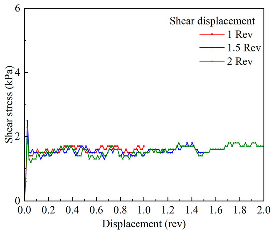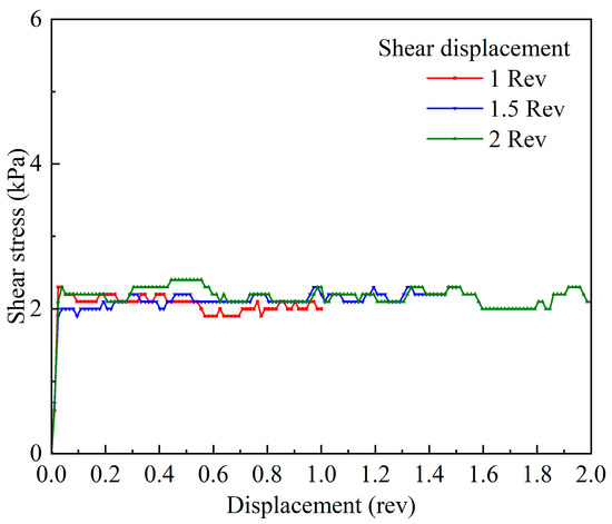 Figure 16 and Figure 17 present a comparison of friction characteristics at three different shear displacements (360, 540, and 720°) under normal stress of 15 kPa, using Slurry 1 and Slurry 2 as lubricants. The figures indicate that the friction coefficient is not affected by shear displacement for Slurry 1. However, this conclusion is based on the assumption of continuous slurry injection in the field. The tests conducted in this study resemble the continuous injection scenario, given the short duration of the tests and the minimal reduction of slurry in the shear box during the experiments. Although shear displacement has little effect on the lubricating performance of thixotropic slurry, it is important to note that the distance of pipe jacking is significantly greater than the shear distance in the tests. Therefore, maintaining a stable injection of uniformly mixed slurry during actual construction is a critical factor in ensuring low friction. This result is very similar to the findings of Barla et al. [11] based on an Italian case; however, in their study, the jacking force increases after a long jacking distance.