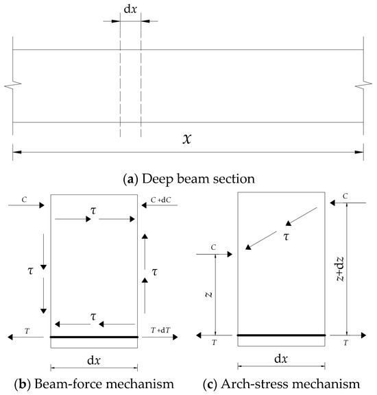 The first item in Equation (10) is called the beam force mechanism (Figure 2b), while the second item is called the arch force mechanism (Figure 2c), in which represents the concrete pressure inside the beam; is the shear stress of the beam section. Figure 2 concisely illustrates the shear transfer of various stress mechanisms in a deep beam as described in Reference [21].