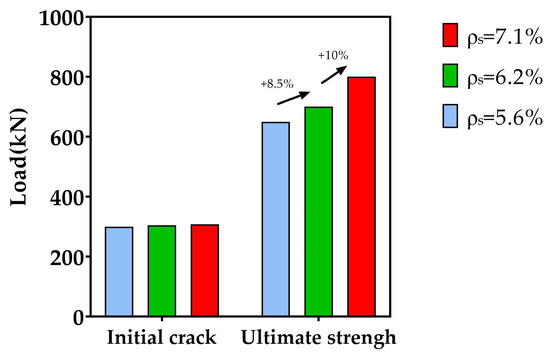 From Figure 3, it can be observed that the increase in reinforcement ratio has little effect on the initial cracking strength of the beam but slightly increases the ultimate shear strength. After increasing the reinforcement ratio from 5.6% to 6.2%, the ultimate shear strength increased by approximately 8.5%. When the reinforcement ratio increased from 6.2% to 7.1%, the ultimate shear-bearing capacity increased by another 10%.