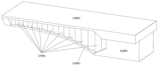 Li et al. [68] introduced and designed a novel non-compressed prestressed CSW–UHPC composite box beam. To assess its cracking behavior and bending performance, bending tests and finite-element analysis were performed on a 5.55 m-long, large non-prestressed CSW–UHPC composite box beam. The experimental results provided insights into the beam’s deflection, strain, crack development, crack morphology, cracking moment, and ultimate bending-bearing capacity. Furthermore, a thorough examination was conducted on the calculation methods for the first cracking moment, nominal cracking moment, and ultimate bending-bearing capacity of the main beam. The analysis results were consistent with the experimental findings. The newly proposed non-prestressed CSW–UHPC composite box beam demonstrated exceptional cracking performance and flexural bearing capacity. Figure 4 presents a simplified diagram based on the description provided in Reference [68].