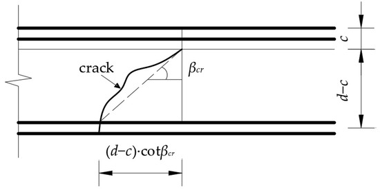 where is the shear-strength contribution of textile fabrics, is the shear-reinforcement ratio, is the web width, is the effective depth, is the distance from the extreme fiber of the cross-section to the center of longitudinal reinforcement, and is the textile stress that can be transmitted via the shear crack. is the angle of the shear crack. Figure 5 is a simplified diagram of the angle of critical shear crack as described in Reference [77].