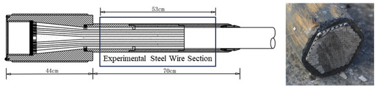 The force in the anchorage area of the cable is relatively complex, and the risk of damage under the combined action of corrosion and fatigue is extremely high. The experiment selects the steel wires from a section of the cable anchorage system, and the specific cutting sections selected are shown in Figure 1. First, the sheath and anchorage of the cable system removed from the actual bridge are cut as shown in Figure 2. It is specified that all steel wires used are the outermost circle of steel wires in the cross-section of this area, and the initial degree of corrosion is consistent. The separated steel wires are wiped clean with a cotton cloth, taken out, stored, and numbered. According to the specifications [24] for the dimensions of round cross-sectional test samples in metal material tensile tests, the corresponding length of steel wire is cut, and a 50 mm steel wire segment is taken for the experiment.