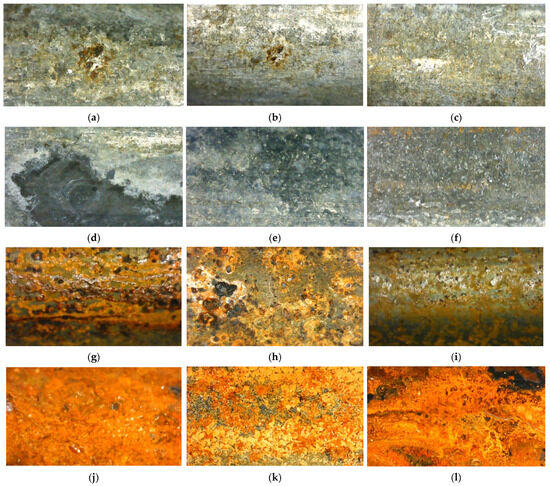 Micromorphology of steel wires after corrosion: (a) Steel wire 1-1, (b) Steel wire 1-2, (c) Steel wire 1-3, (d) Steel wire 2-1, (e) Steel wire 2-2, (f) Steel wire 2-3, (g) Steel wire 3-1, (h) Steel wire 3-2, (i) Steel wire 3-3, (j) Steel wire 4-1, (k) Steel wire 4-2, and (l) Steel wire 4-3.