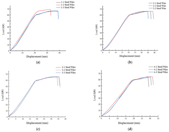Load-displacement relationship of damaged steel wire: (a) natural corrosion, (b) one wet-dry cycle, (c) three wet-dry cycles, and (d) five wet-dry cycles.