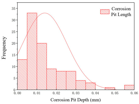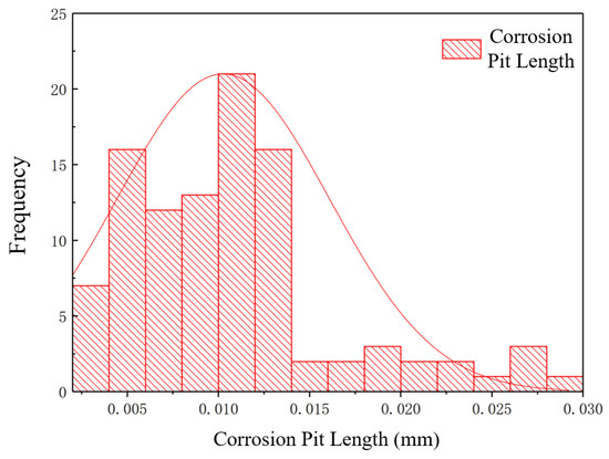 As the steel wire is continuously loaded, stress concentration may occur at the site of the largest etch pit, which can lead to the expansion and rapid development of cracks. Once the number of broken steel wires reaches a threshold, the cable may be at risk of failure. Therefore, it is of great significance to study the distribution, geometric morphology, and dynamic development of corrosion etch pits after the damage of a single steel wire to prevent cable failure. The research samples are based on 5 cable steel wires that have been naturally corroded after steel wire replacement. First, the sections with more severe corrosion on each steel wire are identified. Then, observations are made using a scanning electron microscope (SEM) to find sections with more pronounced etch pits. Subsequently, an industrial electronic microscope (228SD) is used to measure the length and width of the etch pits, and a single-point micrometer is used to measure the depth of the etch pits. Etch pits with a depth range of d ≥ 0.001 mm are included in the statistical range. A total of 100 sets of geometric data for etch pit length, width, and depth are statistically analyzed, as shown in Figure 9, Figure 10 and Figure 11.