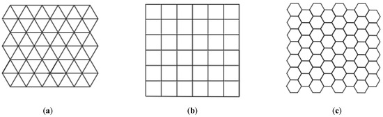 Two-dimensional cellular state: (a) triangular grid, (b) square grid, and (c) hexagonal grid.