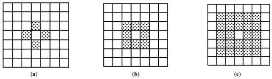 Two-dimensional cellular neighbor types: (a) Von. Neumann, (b) Moore, and (c) Moore extension.