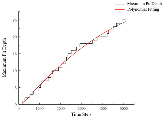 Figure 18 shows the trend of the simulated etch pit depth changes over time steps and the quadratic fitting curve. It should be particularly noted that since the results of the cellular automaton simulation are dimensionless, there is no need to label units on such graphs. The maximum depth of the etch pit increases with the increase in time steps, but the rate gradually tends to level off. This is because after the steel wire undergoes pitting corrosion, the etch pit first develops longitudinally. In the initial stage of corrosion, the corrosion rate of the etch pit towards the depth direction is relatively large, leading to significant geometric changes in the etch pit depth. Once the etch pit depth reaches a certain level, the trend of etch pit development along the lateral direction becomes more apparent, and the trend of etch pit depth changes becomes more moderate.
