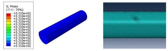 During service, the cable steel wires are mainly subjected to tension. The model boundary conditions are set as fixed and tensioned ends, respectively. To ensure that the steel wire remains in an elastic state, the surface load is taken as 30% of the steel wire’s ultimate strength, which is 531 MPa. The mesh near the etch pit is refined to ensure the computational accuracy near the steel wire etch pit. A 0.02 mm mesh division is used near the etch pit. The solid finite element model of the steel wire and etch pit is shown in Figure 23, and the stress nephograms when the etch pit depths are 0.06 mm, 0.07 mm, and 0.08 mm are shown in Figure 24. Regardless of the size of the etch pit, the maximum stress appears at the bottom of the etch pit and then decreases outward, which can be explained by the fact that the derivation and development of cracks in basic fracture and damage mechanics [35] usually start from the bottom of the etch pit.