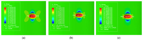 The stress distribution condition within etch pits: (a) etch pit depth of 0.06 mm, (b) etch pit depth of 0.07 mm, and (c) etch pit depth of 0.08 mm.