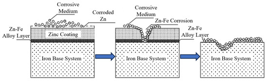 Etch pit morphology of steel wire: (a) corrosion process of galvanized layer and (b) corrosion process of iron substrate.