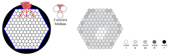 The corrosion grade distribution cloud diagram of the steel wires inside the cable cross-section, obtained through statistical analysis, is shown in Figure 32. Additionally, it illustrates the schematic of the corrosion medium diffusing from the damaged part of the cable into the interior. By combining the analysis of Figure 31 and Figure 32, the multi-age steel wires in the anchorage section did not experience steel wire breaks but suffered from varying degrees of corrosion damage. Looking at the damage distribution across the cable cross-section, the corrosion damage to the steel wires is not uniformly distributed. When the cable is damaged, the side of the steel wires that first contact with the external corrosion medium show more severe corrosion damage. Considering the position of each steel wire, the outer steel wires of the cable are more severely corroded, while the inner steel wires have less damage. Only after the outer steel wires contact with the corrosion medium and undergo electrochemical action do the inner steel wires gradually start to have electrochemical reactions. In the circumferential direction, the closer the steel wire is to the point of entry of the external corrosion medium, the more severe the damage; as the distance increases, the degree of damage decreases accordingly. In the radial direction, the degree of steel wire damage decreases from the outside to the inside.