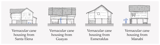- Sandoval, F.; Machuca, J.; Cedeño, L. La Arquitectura Vernácula en el Medio Rural y Urbano de Manabí. Levantamientos, Análisis y Enseñanzas. Análisis Tipológico y Constructivo Como Respuesta al Clima de la Región de Manabí (Ecuador); Universidad de Valladolid: Valladolid, Spain, 2014. [Google Scholar]