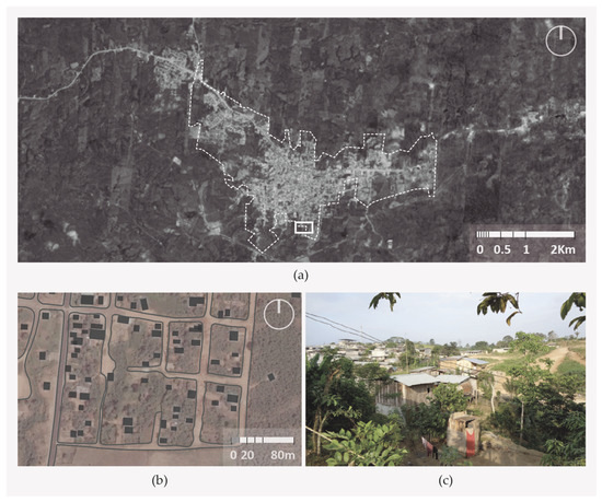 (a) Site plan, City of El Carmen. Taken from Google Maps, 2016; (b) Figure-ground plan depicting the spatial arrangement of a settlement on the city’s periphery. Taken from Google Maps, 2016; (c) Photograph of the site.