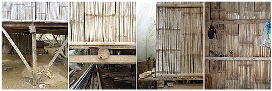 Among the common characteristics, the houses are located separate from each other or at least achieve minimal separation. The volume is oriented so that the main openings are not exposed to direct sunlight, and is developed on a bipartite floor that is elevated from the ground by means of piles ranging from 1.20 to 2.00 m in height. These elevated platforms are a response to the climate and the site’s susceptibility to flooding and rising water. The inhabited volume is a rectangular or square-based prism topped with a lightweight roof with one or two slopes, consisting of a framework of round or tubular bamboo that serves as a base for the placement of several galvanized steel sheets. Some typologies incorporate volumes not connected to the main floor, such as bathrooms or pens, which are located externally (Figure 3).