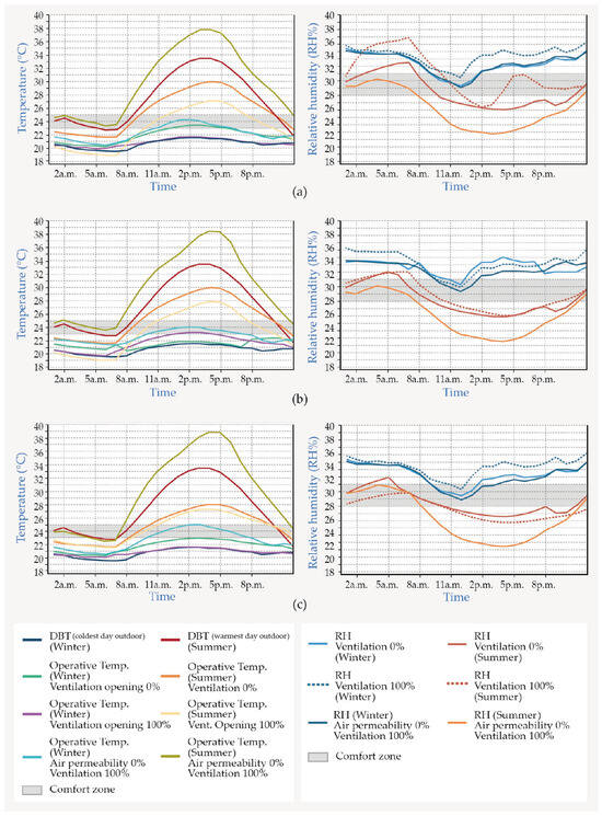 Evolution of internal temperatures and relative humidity in the studied typologies; (a) Typology V1; (b) Typology V2; (c) Typology V3.