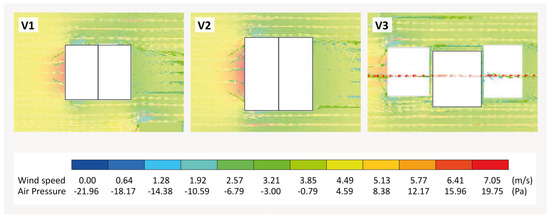 The weather files were worked on in EnergyPlus 8.9 [15] and Meteonorm V8 [16], and then imported into DesignBuilder 6.1. EnergyPlus 8.9 was chosen for its detailed simulations of energy consumption, particularly for thermal performance and passive cooling strategies like cross-ventilation, making it ideal for assessing the bamboo envelope’s impact on indoor comfort. DesignBuilder was selected for its user-friendly interface, allowing quick model adjustments while maintaining simulation accuracy. Together, these tools enabled a comprehensive analysis of thermal transmittance and permeability, providing accurate simulations of how bamboo affects energy efficiency in vernacular housing. The thermal transmittance values of the sections were calculated for a single-sided light bamboo framing enclosure without insulation as presented in the three cases (Figure 6); the thermal load was calculated based on the average activities of a family of four people, and the clo values were set at 0.5 clo for the warm season and 1 clo for the cold season. Other input information for the simulation included: residential building configuration, metabolism factor 1, and calculation type averaged by zone, while no mechanical equipment loads for cooling or artificial lighting were considered. CFD simulations were conducted to assess airflow and thermal behavior across three housing typologies. The key assumptions for the simulations included boundary conditions that represented typical climatic conditions in El Carmen, with the warmest outdoor day in December and the coldest outdoor day in July as reference points. A structured mesh with a refinement near the bamboo panel surfaces was applied to capture detailed airflow patterns and temperature gradients across the envelope. The turbulence model used was the k-ε model, which is standard for simulating airflow in built environments. Permeability was considered according to the calculated permeability modulus and divided between the four facades for data entry into the software Design Builder 6.1. Glazing was not taken into account as the dwellings do not have glazing and are represented as open openings or covered by crushed reed shutters. An external air flow of 5 Ren/hour was used for wind calculations. The mesh size of the study grid in the CFD was between 10 and 18 (X = 18; Y = 17; Z = 10).