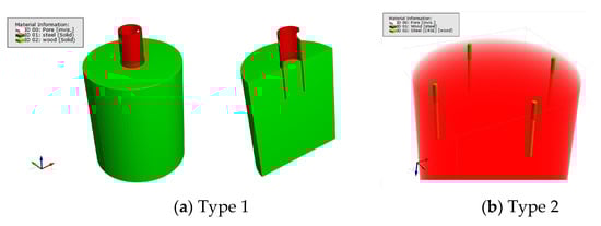 Figure 2 illustrates the specimen configuration and the boundary conditions for testing. As shown in Figure 2a, the measurement of the pull-out load during the extraction of the rod was conducted, and the maximum load was recorded. Type 2, specifically designed for evaluating the proposed connection method in this study, is configured to measure the maximum load by screwing the connection plate, as depicted in Figure 2b. The testing device used for type 1 tests is the MTS 244.21G2 model with a maximum stroke of 274 mm and a maximum capacity of ±50 kN. The testing device used for type 2 is the JKS UTM-600 model with a maximum stroke of 600 mm and a maximum capacity of ±600 kN. For the type 1 test, three repeated tests were conducted on the specimen used for conventional timber pile connection joints. For type 2, tests were performed under nine different conditions, which include three connection positions (4, 6, 8) and three fastener types (8 pi-75 mm, 10 pi-90 mm, 14 pi-80 mm). The materials and geometries for these configurations are summarized in Table 3.