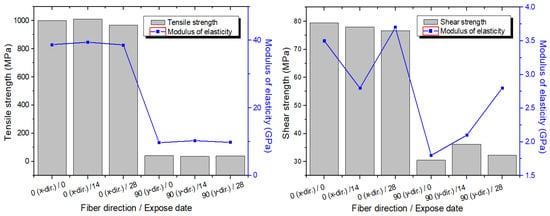 Tensile and shear test results after immersion in a 5% NaCl solution. The graphs depict the tensile and shear strength alongside the modulus of elasticity for specimens exposed to different fiber directions and immersion periods (0, 14, and 28 days).