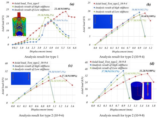 Comparison of pull-out test and FVM analytical results for specimens. The graphs present axial load versus displacement for type 1 (a) and type 2 specimens (b–d), comparing experimental data with high-stiffness and low-stiffness FVM analytical models. The analysis results include stress distribution contours, showing load behavior and failure modes for each test configuration. Each graph indicates the maximum load achieved during testing and its corresponding displacement.