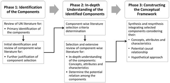 There is no absolutely correct method for constructing a conceptual framework that provides the ideal structure for presenting an argument []. However, the framework should make sense as it will eventually affect its application [,]. Even when new information comes to light and changes are made, it continues to be the main reference point []. The conceptual framework in this research was built based on a literature review with a continuous interchange between literature collection and review. For this purpose, relevant works of literature were searched through Google Scholar and the UNSW library collection. The literature reviewed included peer-reviewed journal articles, conference papers, academic books and reports, considering their reliability []. Additionally, studies published until 2022 were considered to reflect conventional, established as well as contemporary knowledge. Figure 1 shows the research methodology. Broadly, this research was carried out in three phases [,]. These phases are discussed in the following sections.