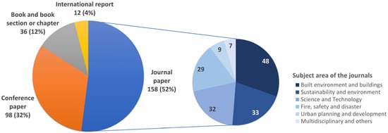 More than 90% of the studies selected were published after 2010. Figure 2 shows the distribution of the studies selected with respect to the publication type. The publications selected for this study included journal articles, conference papers, books and book sections or chapters, and international reports. More than half of the selected studies are journal papers (n = 158). Figure 2 also shows the further distribution of the selected journal papers with respect to the subject areas of the journals in which the selected studies are published. Most of the selected papers (48 out of 158 selected journal papers) are published in the built environment and building related journals, where the top contributing journals are Buildings, Journal of Building Engineering, and Building Research and Information. Journals related to sustainability and environment (e.g., Sustainability, Sustainable Cities and Society, and International Journal of Environmental Technology and Management), science and technology (e.g., Applied Sciences, Sensors, and IEEE Internet of Things Journal), and fire, safety and disaster (e.g., Fire Safety Journal, Fire, and International Journal of Disaster Resilience in the Built Environment) constitute almost similar amounts of the selected publications. The rest of the selected journal articles are published in journals that focus on urban planning and development (e.g., Cities, Journal of Urban Affairs, and Urban Design and Planning), and multidisciplinary and other journals (e.g., PLoS ONE and PSU Research Review).