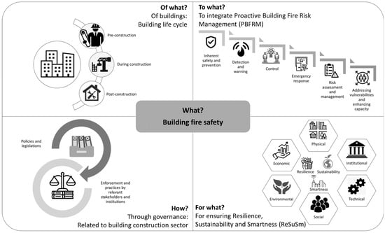 When addressing any disaster, resilience, sustainability and smartness (ReSuSm) must be ensured [,,,]. Consideration of ReSuSm together enhances the capacity to cope with changes, reduce the impact, recover from disaster, and thereby ensure sustainability in the long run in the face of an uncertain future [,,]. Different aspects of ReSuSm in the disaster context in the built environment and buildings have been emphasized in numerous research studies [,,]. A few research studies considered ReSuSm in the building fire context as well [,,]. Therefore, while improving building fire safety, ensuring ReSuSm has been emphasized in this research. Hence, ReSuSm explains the “for what” component of the proposed conceptual framework.