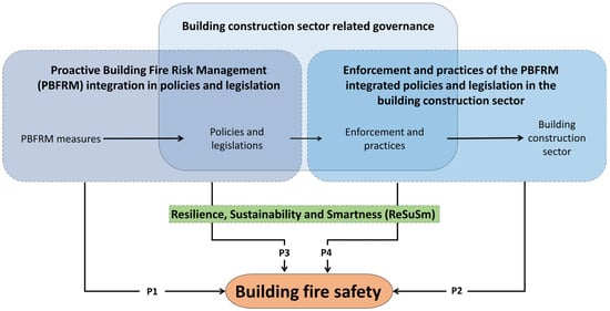 As elaborately discussed in Section 3.1.4, ReSuSm in the building fire context are concerned with capacity enhancement to resist, withstand, reduce impacts and recover from building fires to ensure resilience, thereby ensuring sustainability in the long run and utilizing different features of smartness. Therefore, while integrating PBFRM in the building construction sector governance, ReSuSm are required to be ensured. Such consideration leads to avoiding or minimizing the effects on buildings, ensuring the effectiveness of building construction sector governance, technology integration ensuring their technical performance, enhancing the safety of people, environmental impact reduction and economic loss reduction in the event of building fires. These further direct toward improving building fire safety (explained in Section 3.1.1). Therefore, proposition P3 of the proposed conceptual framework looks into the existing condition of ensuring ReSuSm while integrating PBFRM in the building construction sector policies and legislation and their effects on improving building fire safety. On the other hand, proposition P4 looks into the existing condition of ensuring ReSuSm during enforcement and practices of the PBFRM-integrated policies and legislations in the building construction sector and their effects on building fire safety.
