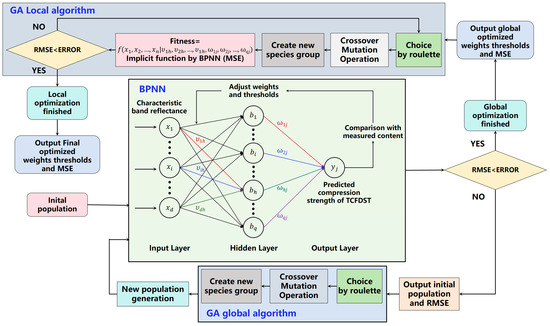 - Once the global optimization through GA achieves the desired accuracy, the process moves into the local optimization phase. The final optimized weights and thresholds from the GA are used as inputs for the BPNN, and the BPNN is employed as a prediction tool (without additional training) to further fine-tune the weights and thresholds. During this phase, GA continues to refine the solution by adjusting the weights and thresholds through additional selection, crossover, and mutation processes. This continues until the RMSE satisfies the predefined accuracy requirements, resulting in the final set of optimized weights, thresholds, and minimal error.