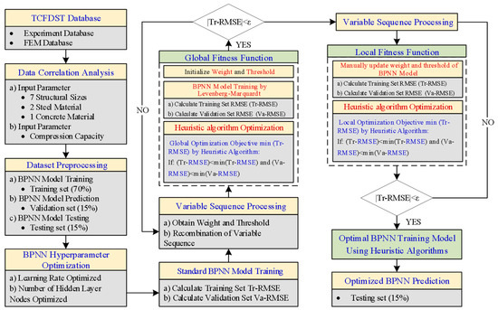 A tapered concrete-filled double-skin steel tubular (TCFDST) structure has been used as the main framework in transmission towers, offshore facility platforms, and turbine towers owing to its excellent mechanical properties. In order to solve the difficulties of calculating the axial compressive capacity of TCFDST members due to the variations in cross-section, this paper applied heuristic optimization algorithms such as Genetic Algorithms (GAs), Particle Swarm Optimization (PSO), Simulated Annealing (SA), and Ant Colony Optimization (ACO) to enhance a Backpropagation Neural Network (BPNN) model. A predictive model incorporating both global and local optimization strategies for the axial compressive capacity of a TCFDST structure is proposed. A comprehensive axial database for TCFDST members, comprising 1327 sets of experimental and finite element analysis results, was established, with ten types of component dimensions and material parameters selected as input variables and compressive bearing capacity as the output variable. This study developed and assessed four BPNN models, each optimized by a different heuristic algorithm, against various machine learning algorithms and standards. The heuristic-algorithm-optimized BPNN models demonstrated superior accuracy in predicting the axial compressive capacity of TCFDST members. Through parametric analysis, this study identified the relationship between the model’s bearing capacity predictions and each input parameter, confirming the model’s broad applicability. The optimized BPNN model, refined with heuristic algorithms, provides a significant reference for addressing the computational challenges associated with the load-bearing capacity of TCFDST structures and facilitating their application.