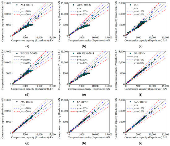 In recent years, domestic and international scholars have conducted extensive experimental research on the axial compression performance of concrete-filled double-skin steel tubular (CFDST) members [17,18,19]. Based on this research, they have established formulas for calculating axial compression capacity through linear and nonlinear regression methods, incorporating the confinement theory, unified theory, and superposition theory [20,21,22]. Apart from the axial compression capacity formulas based on mechanical principles, with the gradual maturity of machine learning algorithms, applying deep learning algorithms to the field of engineering design to solve structural design problems has become a new approach in building structural design and performance analysis [23,24,25]. Wang et al. [23] trained three methods, including support vector machines (SVMs), random forest regression (RFR), and neural networks (NNs), on a database of CFST eccentric compression test samples, and established a machine learning model with dimensional and material parameters as the input layer and flexural capacity as the output layer. Hong et al. [25] compared various machine learning algorithms with normative capacity calculation formulas and concluded that the K-Nearest Neighbors (KNN) algorithm exhibits high accuracy in predicting the axial compressive capacity of CFDST members. Nguyen et al. [26] utilized three heuristic optimization algorithms (SCSO, GWO_WOA, and ARO) to tune the hyperparameters of the gradient boosting regression (GBR) algorithm and analyzed the prediction accuracy of different optimization algorithms for the axial compressive capacity of CFDST columns. Chandramouli et al. [27] predicted the axial compressive capacity of CFDST members using six machine learning models and provided the optimal calculation model applicable to various fiber composite materials and steel-confined core concrete. Zhao et al. [28] conducted a comparative analysis of the predictive effectiveness of standard backpropagation neural network (BPNN) and PSO-BPNN models for the axial compressive capacity of CFDST members and recommended a member capacity prediction model based on domestic and international standards.