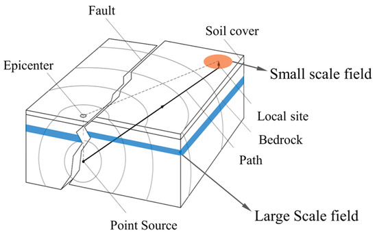 Considering the physical process of earthquake motion generation and propagation, Wang and Li (2011) [33] decomposed the entire process into three aspects: seismic source—propagation path—local site, and considered the three aspects to be independent of each other. As shown in Figure 1, the vibration caused by the fault rupture at a point underground propagates in the bedrock medium. When it reaches the local site, it propagates upward through the covering soil layer to create ground motions on the surface. The ground motions propagate forward horizontally at the local site and affects each other, forming a ground motion field with a spatial variation effect.