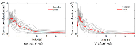 A typical sequential ground motion is illustrated in Figure 3. It can be observed that the mainshock and aftershock differ in amplitude, hold-up time, and waveform. The mainshock and aftershock response spectra of the sequential ground motions used in this paper are shown in Figure 4. It can be seen that compared with aftershocks, the platform segment of the mean response spectrum of the mainshocks becomes longer and the long-period components of the ground motion increase.